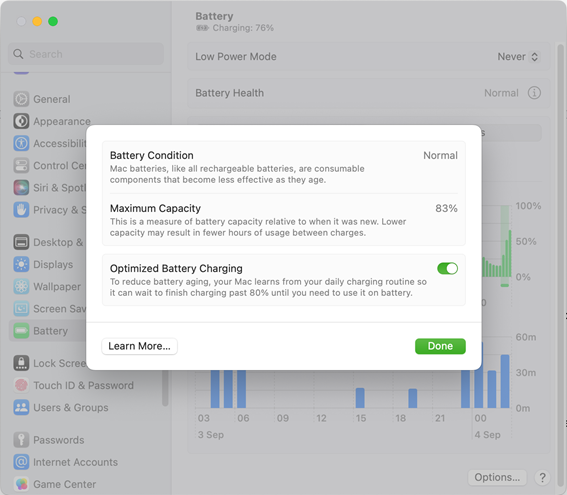 Para evitar esto (al menos en cierto grado), asegúrate de descargar tu portátil de vez en cuando. Además, ve a Configuración del Sistema > Batería y luego haz clic en el pequeño ícono de “i” junto a Salud de la Batería.