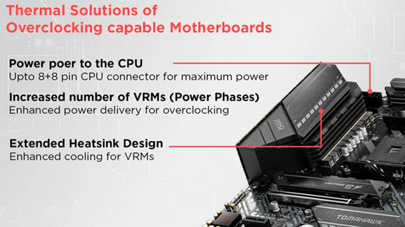 Con placas base de gama alta, especialmente aquellas diseñadas para overclockear CPU, los VRM ven un aumento en las fases de potencia y el tamaño del disipador de calor para facilitar este mayor rendimiento.